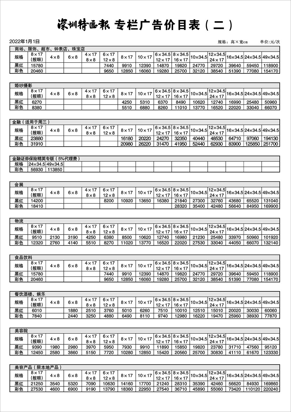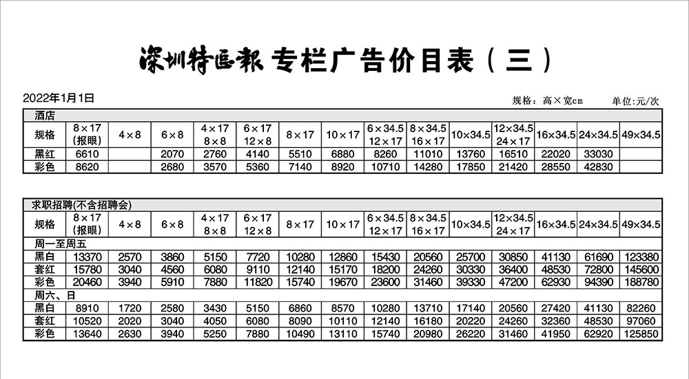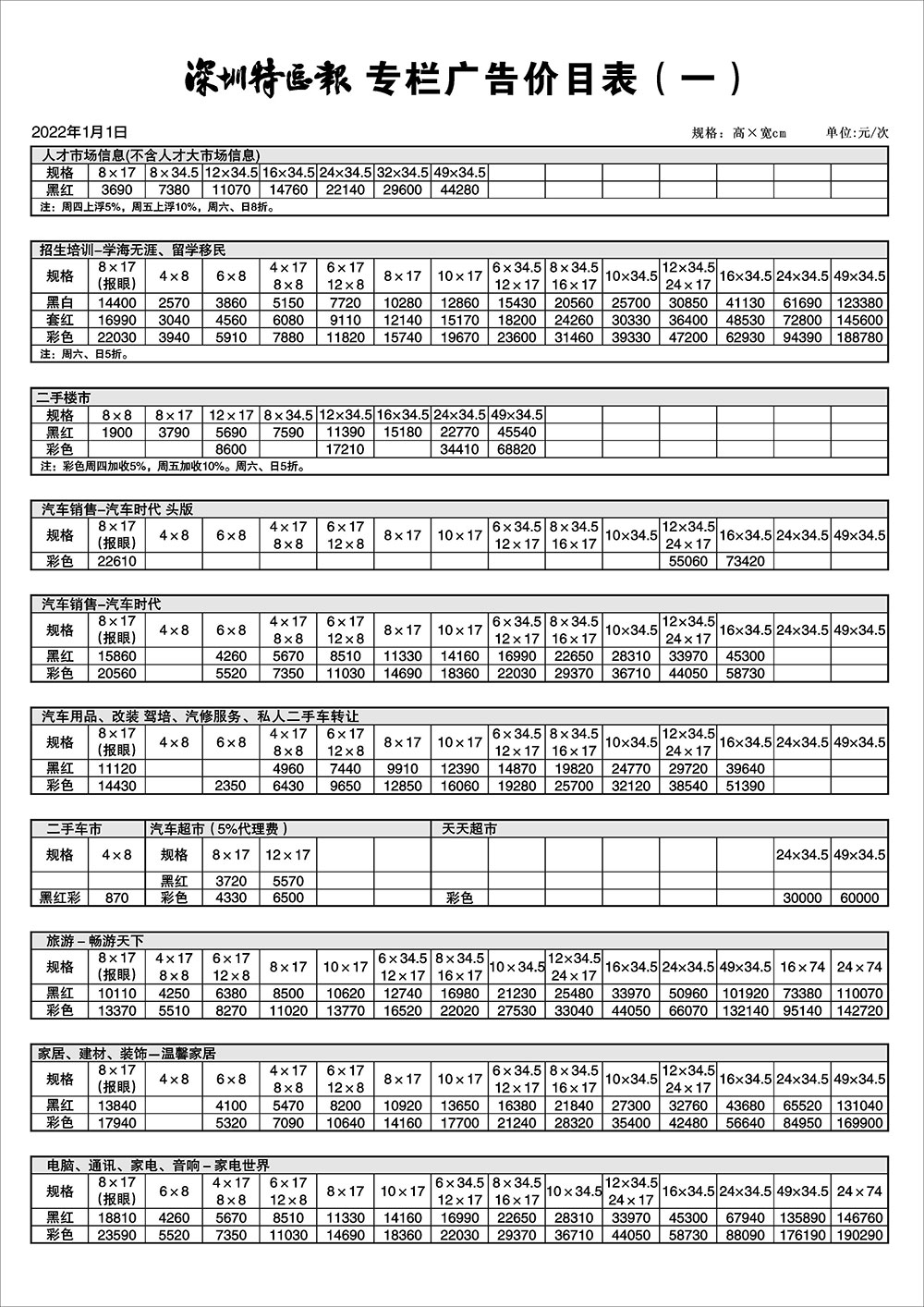 深圳特區(qū)報(bào)專欄廣告價(jià)目表