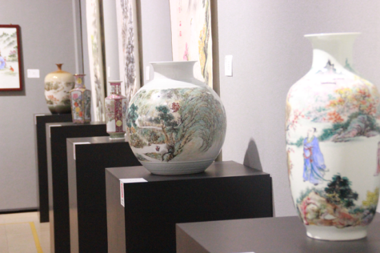 值得一提的是,劉致遠除了展示山水、花鳥等畫作,同時帶來了多件精心創(chuàng)作的廣彩陶瓷作品,各種花瓶、茶具、餐具上,有人物、風(fēng)景以及動物等彩色繪圖,雖為陶瓷擺設(shè)器具,卻也和書畫同樣具備細意觀賞的價值。