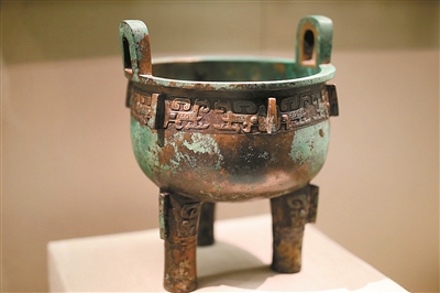 在此次展出的青銅器中,有一部分是僅銘有族氏銘文的,即家族的名號(hào),以表示是該物品的所屬人。代表族徽的銘文,象形的程度會(huì)比較高,主要用作禮器。比如展出的鳥父甲鼎,內(nèi)里的銘文就是自上而下三個(gè)字,其中“鳥”字則幾乎完全是鳥的象形,這個(gè)鳥就是鳥族的族徽,鳥族族群在當(dāng)時(shí)十分龐大。而后面兩個(gè)字就是“日名”,日名是指古人對(duì)逝人的稱謂,一般以甲乙丙丁戊己庚辛壬癸十天干前加上受祭者的輩分格式出現(xiàn)。這種禮器又叫做日名器,既點(diǎn)明了受祭者,又表明了作器者和受祭者的關(guān)系。