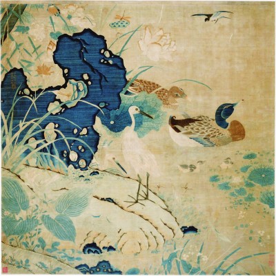 朱克柔 《緙絲蓮塘乳鴨圖》是現(xiàn)存宋代緙絲畫(huà)作中的上乘之作,它出自名家之手,流傳有序,且幅式巨大,絲絲縷縷皆勻稱適宜、層次分明。圖中紅葉白鷺,綠萍翠鳥(niǎo),蜻蜓草蟲(chóng),雙鴨游樂(lè),畫(huà)面生動(dòng)活潑,色彩富有變化。青石處有緙織隸書(shū)小款“江東朱剛制蓮塘乳鴨圖”,下有“克柔”印一方。(記者 李婷)
