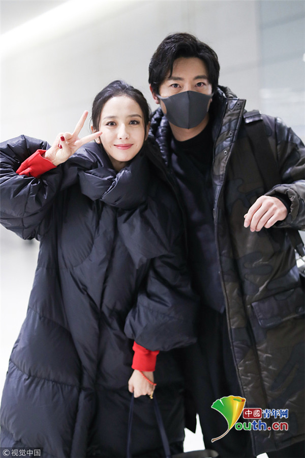 佟麗婭郭京飛賣萌合影 個性羽絨服俏皮減齡
