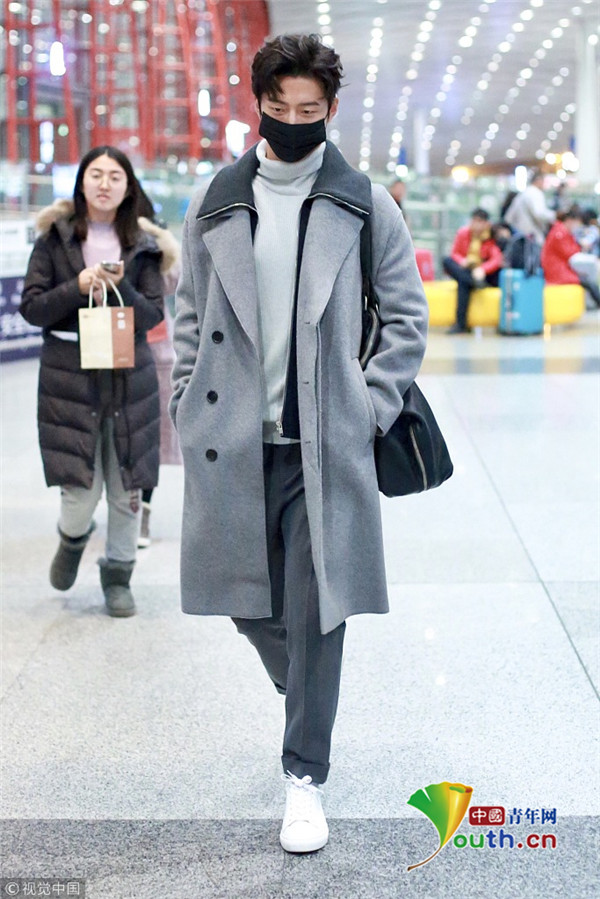 ??2017年12月13日,北京,竇驍身著灰色大衣、戴口罩現(xiàn)身機(jī)場,為粉絲大方簽名,見鏡頭開心比V揮手親和力滿分。