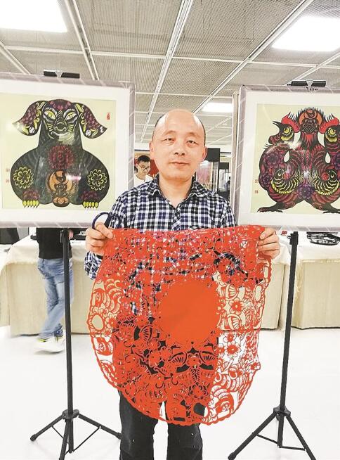 在展覽現(xiàn)場(chǎng),山西剪紙非遺項(xiàng)目傳承人、工藝美術(shù)大師游洋(又名石羊)給觀眾演示出神入化的剪紙藝術(shù),手握一把剪刀游刃有余,眼花繚亂間已剪出復(fù)雜精美的狗年圖案。