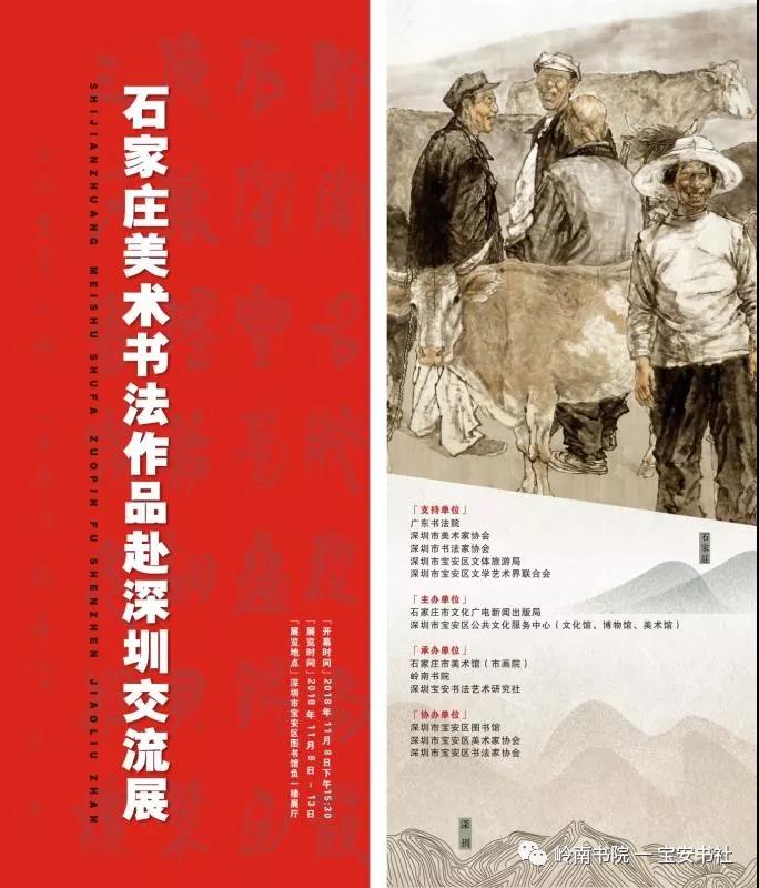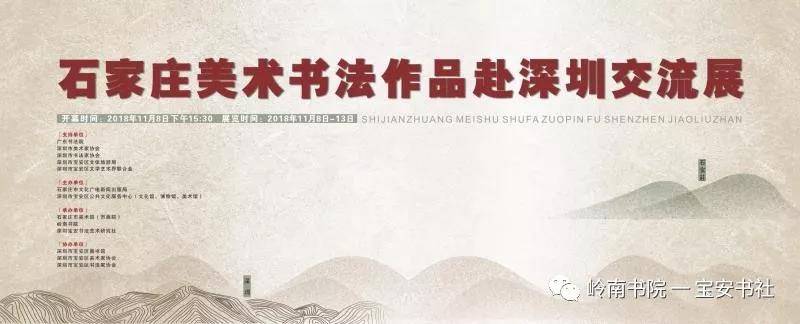 2018年11月8日下午15:00,由石家莊市文化廣電新聞出版局、深圳市寶安區(qū)公共文化服務(wù)中心(文化館、博物館、美術(shù)館)主辦,石家莊市美術(shù)館(市畫院)、嶺南書院、深圳寶安書法藝術(shù)研究社承辦,深圳市寶安區(qū)圖書館、寶安區(qū)美協(xié)、寶安區(qū)書協(xié)協(xié)辦并得到深圳市書法家協(xié)會、美術(shù)家協(xié)會、寶安區(qū)文體旅游局、寶安區(qū)文聯(lián)的大力支的 “ 石家莊美術(shù)書法作品赴深圳交流展 ” 在深圳市寶安區(qū)圖書館負一樓展廳隆重開幕——