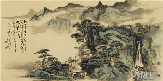 范陽(yáng)先生的山水畫(huà),筆法近取傅抱石、黃秋園,遠(yuǎn)溯“元四家”中黃公望、王蒙。筑居楊岐山下,使先生日夜親近自然山水,吐納天地,養(yǎng)浩然之氣?!巴鈳熢旎械眯脑础保拼鷱埈b一言道破了山水畫(huà)家修養(yǎng)、悟性的不二法門(mén)。范陽(yáng)先生正是以自然(造化)為營(yíng)養(yǎng),入而為心靈化育,镕冶成亦古亦新,遠(yuǎn)離塵俗的獨(dú)特風(fēng)格。近作《松風(fēng)泉聲》(五屏聯(lián))氣勢(shì)磅礴,大開(kāi)大合,細(xì)究又十分謹(jǐn)嚴(yán)。筆墨與丘壑融為一體,既豪放又穩(wěn)健。淺絳青綠的設(shè)色,使畫(huà)面有蔥翠欲滴之感??胺Q(chēng)山水畫(huà)中的經(jīng)典。
