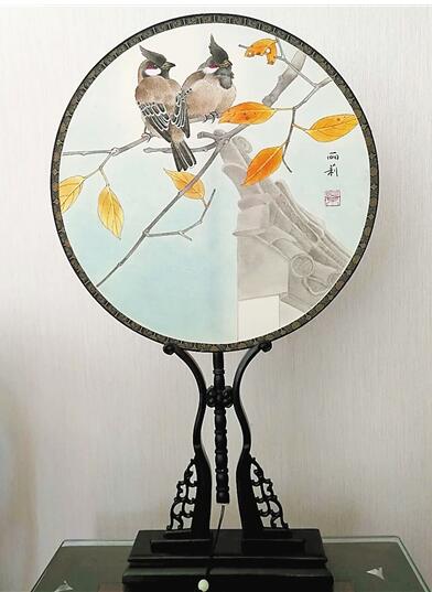 景麗莉創(chuàng)作的團(tuán)扇《晨鳥(niǎo)飛啼棲枝頭》。