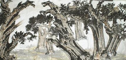 另一個(gè)他擅長(zhǎng)的題材是古柏樹。1992年他去泰山采風(fēng)途中。山上的古柏樹生機(jī)勃發(fā),堅(jiān)韌不拔,給他帶來(lái)了一種震撼的力量。他當(dāng)時(shí)就想將這些古柏入畫,為古柏注入精神意義。從此,在孔府、孔林、古蜀道以及陜西等地都留下他觀察古柏的足跡。有評(píng)論家認(rèn)為,他的藝術(shù)作品不但在整體的構(gòu)圖上自然、清新和潤(rùn)朗。而且在整體的布局上,疏密相間,虛實(shí)相融,用獨(dú)有藝術(shù)感覺(jué)構(gòu)建出了一個(gè)既蘊(yùn)含了詩(shī)情畫意,又張揚(yáng)了文化魅力和內(nèi)心情感的藝術(shù)空間。