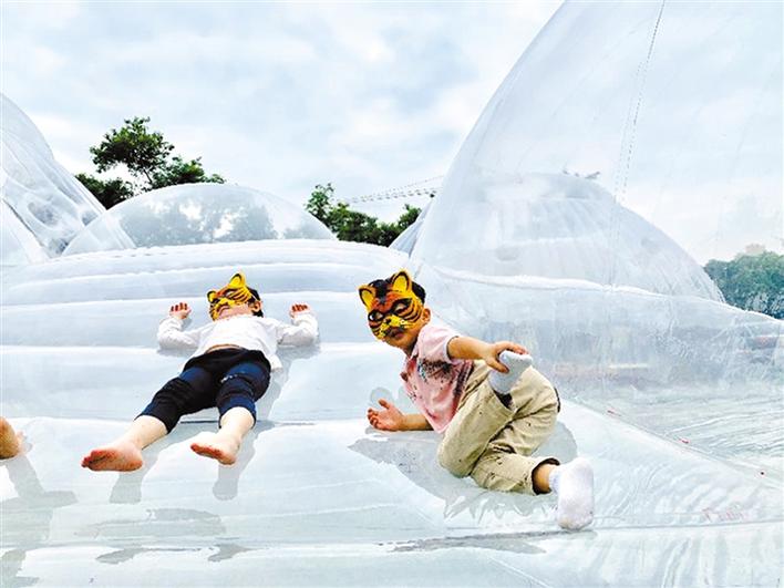 在本屆鳳凰花嘉年華主會(huì)場(chǎng)——華僑城體育文化中心綠地空曠自然的草坪上,由本土新銳建筑設(shè)計(jì)師黃澤林設(shè)計(jì)和創(chuàng)作的巨型充氣建筑“空氣山”拔地而起。人們可以自由地在“空氣山”的多維表面上嘗試坐、臥、立、躺的體驗(yàn)。而張凱琴、張齊努、劉小青三位國(guó)內(nèi)知名自然藝術(shù)家即興創(chuàng)作的“歇腳云”等自然裝置,通過空間藝術(shù)作品與公眾的互動(dòng),喚醒著人們對(duì)自然的熱愛。