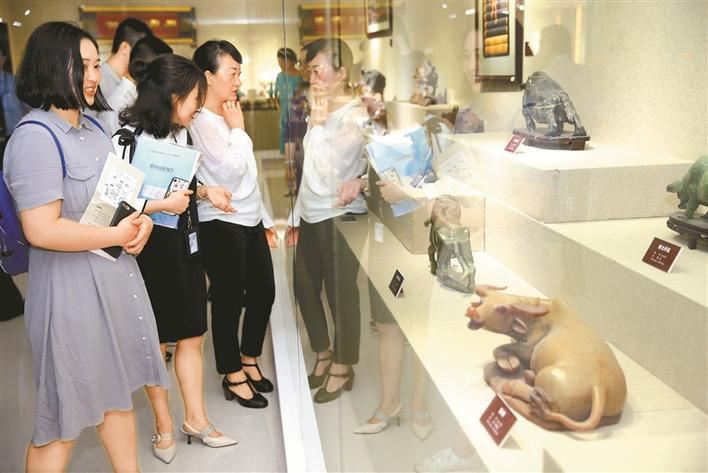 牛雕、牛繡、牛畫(huà)……厲有為無(wú)償捐贈(zèng)的1400余件牛藝術(shù)品來(lái)自不同的國(guó)家和地區(qū),形成于不同的歷史時(shí)期,包括玉石、金屬、陶瓷、竹木、刺繡、剪紙、書(shū)畫(huà)等各種材質(zhì)和工藝,具有重要的歷史文化價(jià)值和深刻的精神內(nèi)涵。比如,有一尊戰(zhàn)國(guó)銅牛的收藏品,造型生動(dòng)、設(shè)計(jì)精巧、工藝考究,牛脖子上雕刻的是長(zhǎng)冠鳳圖案,牛背上雕刻的是太陽(yáng)圖案,牛身上是龍鳳紋。