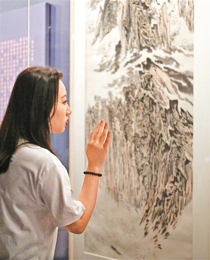 展覽一經(jīng)推出,就迅速吸引了絡(luò)繹不絕的市民前來參觀。面對暑期人流量大的情況,關(guān)館特地推出了豐富多樣的公共教育服務(wù)。不僅有志愿者導(dǎo)覽,還有親子工作坊、數(shù)字化設(shè)計等等,內(nèi)容接地氣,趣味橫生。記者看到不少孩子都在家長的指引下拿著畫本在美術(shù)館里臨摹、學(xué)習(xí),通過這種方式與國畫家們一起交流切磋。