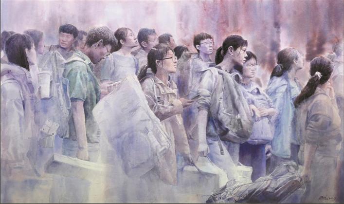 藝術(shù)家方曉龍此次有兩件作品入選,分別是水彩畫《追夢》和與青年藝術(shù)家張凱合作的油畫《掠過晨曦的夢想》。兩幅作品聚焦同一主題——青年學(xué)子參加藝考,這來自他對這一題材長年累月的觀察。