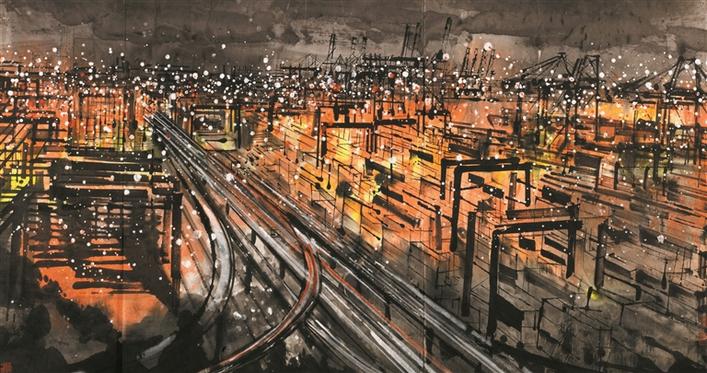 楊曉洋創(chuàng)作的《東方巨港——璀璨鹽田》是此次入選的國畫作品之一。作品以深圳港夜色為主題,體現(xiàn)了中國改革開放前沿城市深圳滄海桑田的巨變和這座城市的繁榮景象。同樣是表現(xiàn)現(xiàn)代題材的城市景觀,從楊曉洋的作品中就可看出以對版畫的黑白對比手法、平面構(gòu)成的象征形式、夜景特色的表現(xiàn)手法的出色運用等方式來表達出作者對都市景觀的趣味。