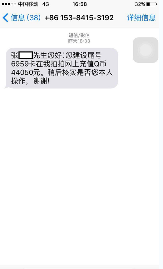 一天,客戶張先生收到一條手機(jī)號(hào)碼為15384153192發(fā)來的短信:“張先生您好∶您建設(shè)銀行尾號(hào)6959卡在我拍拍網(wǎng)上充值Q幣44050元,稍后核實(shí)是否您本人操作,謝謝!”起初,張先生見是陌生手機(jī)號(hào)發(fā)來的短信,就并未在意,可隨后卻收到建行95533客服中心發(fā)來的短信提醒,稱他的銀行賬戶發(fā)生了一筆44050元的轉(zhuǎn)賬支取業(yè)務(wù)。