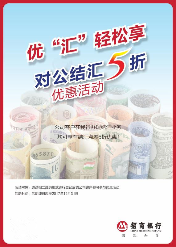 近日,記者從招行深圳分行了解到,自2017年8月1日至2017年年底,招商銀行深圳分行特別推出結(jié)匯尊享優(yōu)惠活動(dòng)?;顒?dòng)期間,凡公司客戶,可在招商銀行深圳分行轄內(nèi)(含珠海分行及惠州分行)任一網(wǎng)點(diǎn)通過(guò)掃描指定二維碼進(jìn)行登記,登記后辦理結(jié)匯業(yè)務(wù)即可享受結(jié)匯點(diǎn)差五折優(yōu)惠。(張怡)