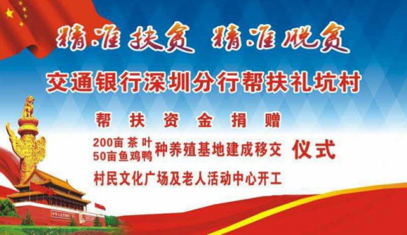 自交通銀行深圳分行對(duì)口幫扶禮坑村,開展"雙精準(zhǔn)"扶貧以來,禮坑的經(jīng)濟(jì)社會(huì)發(fā)展和村容村貌發(fā)生顯著變化,積貧積弱的小山村呈現(xiàn)欣欣向榮的新氣象。積土成山、積水成淵,200畝茶山破土而出、蔚然成綠,50畝養(yǎng)殖基地竣工落成、生機(jī)勃勃,三萬魚苗、數(shù)千雞苗茁壯生長,村民文化廣場、老年活動(dòng)中心、道路硬底項(xiàng)目、山村亮燈工程躍然紙上,逐次開工建設(shè),禮坑正創(chuàng)造并綻放新的希望,村民笑容淳厚,各級(jí)由衷點(diǎn)贊。紫金縣領(lǐng)導(dǎo)、縣扶貧工作總負(fù)責(zé)人廖振輝表示:"交通銀行深圳分行是真重視、真扶貧、扶真貧,在對(duì)口紫金的扶貧單位中首屈一指,無論在河源市的扶貧工作考評(píng)中,還是在代表河源參加的廣東省扶貧工作考評(píng)中,雙雙獲得優(yōu)秀評(píng)價(jià),真誠感謝交行,紫金要和交行一起努力,讓禮坑成為社會(huì)主義新農(nóng)村示范村建設(shè)中的示范點(diǎn)"。