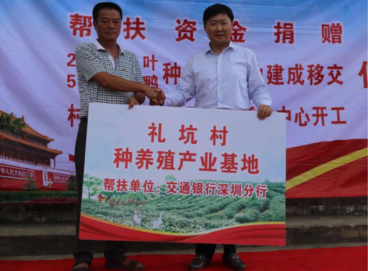 當(dāng)日,交通銀行深圳分行籌劃建設(shè)的茶山、種養(yǎng)殖基地、新一批雞苗和2017年度專項(xiàng)扶貧資金正式移交和撥付給禮坑村,并舉行了村民文化廣場開工奠基典禮。陳隃表示,交行深圳分行把幫扶禮坑村做為落實(shí)黨的政策的重點(diǎn)工作,做為國有銀行承擔(dān)政治責(zé)任、社會(huì)責(zé)任的重要出發(fā)點(diǎn),做為加強(qiáng)黨的建設(shè)的重要抓手,下一步圍繞三個(gè)轉(zhuǎn)變繼續(xù)深化扶貧工作,一是工作目標(biāo)轉(zhuǎn)向社會(huì)主義新農(nóng)村建設(shè),努力將禮坑村建設(shè)成新農(nóng)村建設(shè)示范村中的示范點(diǎn);二是工作方法從貧困戶脫貧向產(chǎn)業(yè)脫貧轉(zhuǎn)變,繼續(xù)發(fā)掘新項(xiàng)目,形成更加持續(xù)化的產(chǎn)值和收益;三是在制度建設(shè)上下功夫,強(qiáng)化社會(huì)主義新農(nóng)村建設(shè)的制度先行和制度示范。