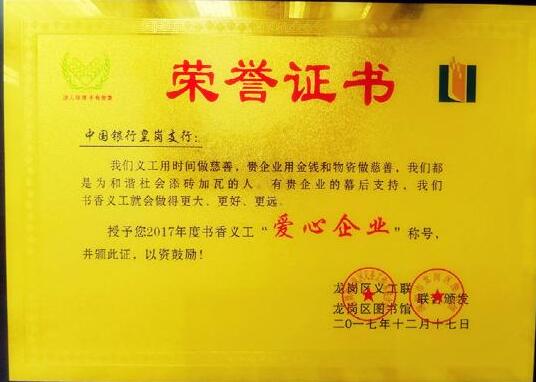 深圳新聞網(wǎng)訊 近日,深圳市龍崗區(qū)義工聯(lián)、龍崗圖書館書香義工2017年度總結(jié)大會在龍崗區(qū)文體中心召開。大會授予中國銀行深圳皇崗支行書香義工“愛心企業(yè)”稱號,并聯(lián)合頒發(fā)榮譽(yù)證書。