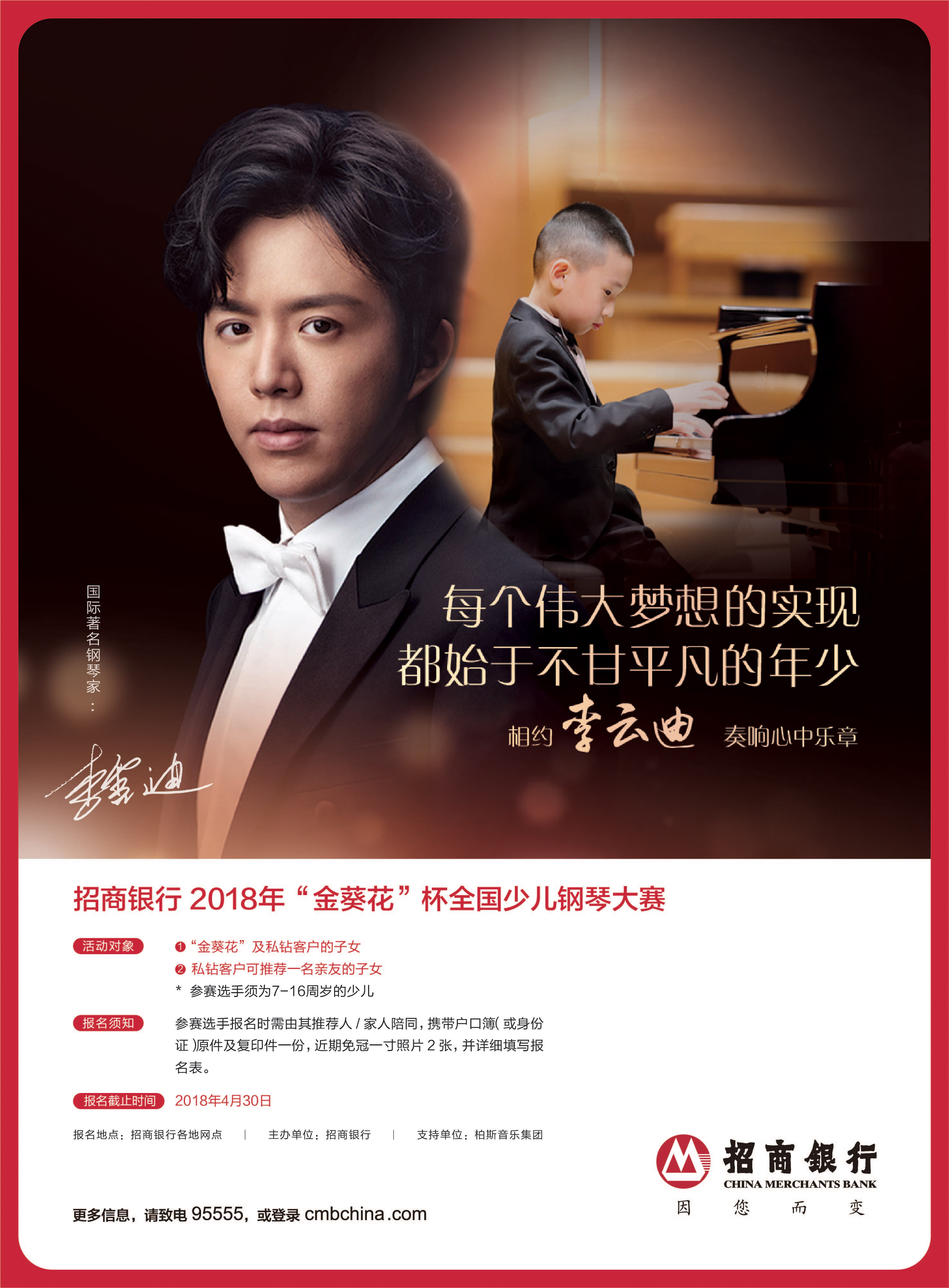 據(jù)大賽組委會(huì)介紹,本屆大賽主辦單位為招商銀行,支持單位為柏斯音樂(lè)集團(tuán)。報(bào)名時(shí)間截止至4月30日,初賽將在5月進(jìn)行,7月下旬舉行總決賽。招商銀行“金葵花”客戶(hù)、私鉆客戶(hù)7至16周歲的子女均可報(bào)名參賽。此外,私鉆客戶(hù)還擁有額外推薦一名選手參賽的權(quán)益。