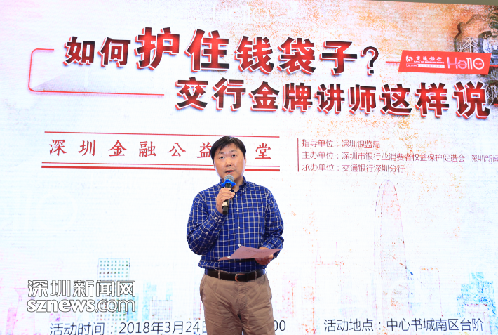 3月24日,在深圳中心書城南臺階,由深圳銀監(jiān)局指導(dǎo),深圳新聞網(wǎng)、深圳市銀行業(yè)消費者權(quán)益保護(hù)促進(jìn)會主辦,交通銀行深圳分行承辦的大型系列公益活動“深圳金融公益講堂”第四講如期開講。活動邀請了來自交通銀行深圳分行的三位金牌講師從專業(yè)角度為市民朋友們詳細(xì)講解理財知識,現(xiàn)場解答市民的金融消費困惑。