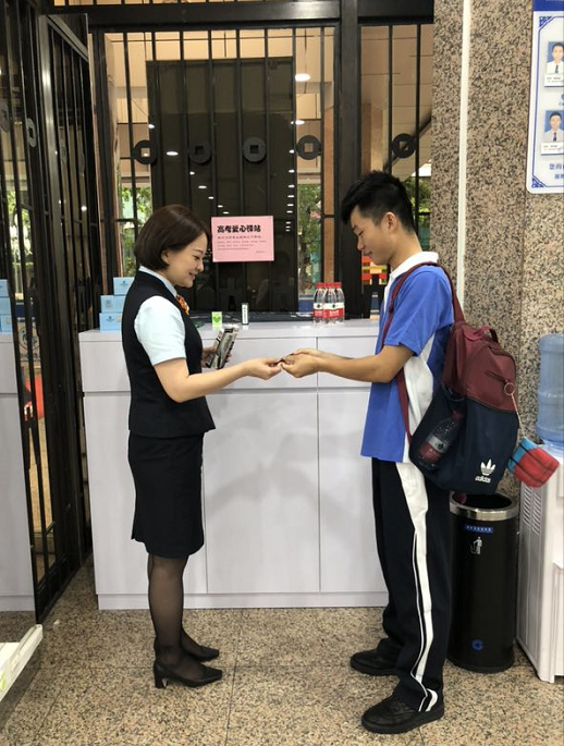 中午時分,一位紅嶺中學的考生在銀行大堂經(jīng)理的熱情招呼下免費領取了文具盒礦泉水。通過聊天,這位考生表示今天上午考得很好,對建行的助力高考愛心驛站服務表示感謝。(通訊員 梁莉)
