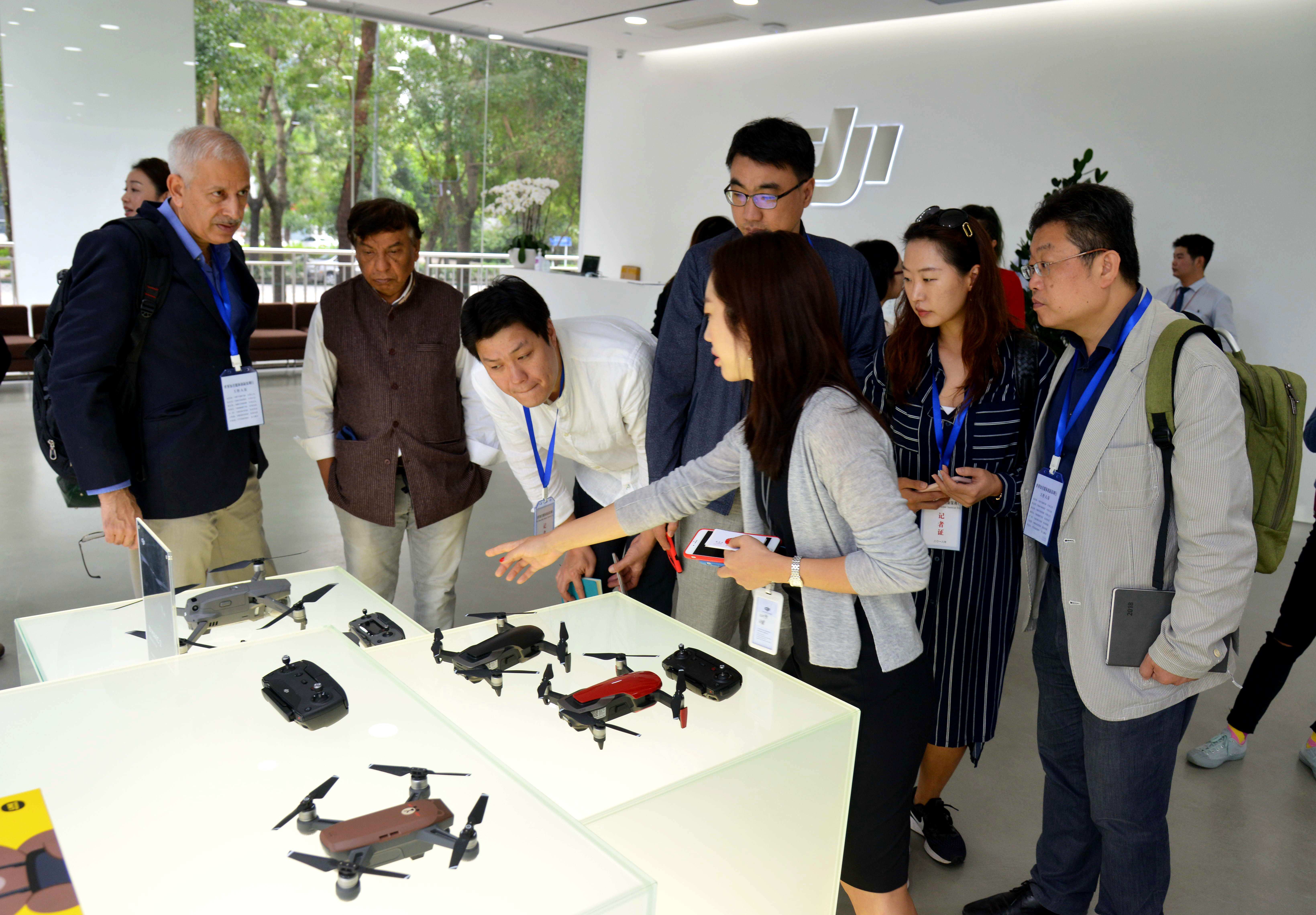 各國記者們?cè)诖蠼畡?chuàng)新科技有限公司參觀無人機(jī)產(chǎn)品。