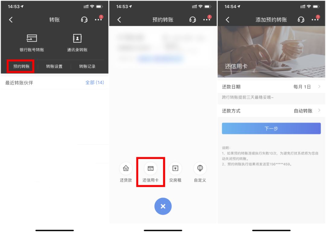 在轉(zhuǎn)賬頁面點(diǎn)擊“預(yù)約轉(zhuǎn)賬”,選擇“還信用卡”。根據(jù)提示選擇日期、方式等,每月即可收到還款提醒,媽媽再也不用擔(dān)心我的信用卡逾期了!