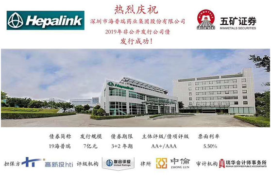 據(jù)悉,此次私募債券“19海普瑞”發(fā)行規(guī)模為7億元,期限3+2年,票面利率5.5%。在深圳高新投的助力下,債券募集過程中,得到了各大金融機(jī)構(gòu)的踴躍認(rèn)購,獲得2倍超額認(rèn)購額,5.5%的票面利率也創(chuàng)下近期AA+民營(yíng)企業(yè)發(fā)債利率新低。