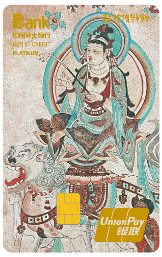 光大敦煌聯(lián)名信用卡卡面設(shè)計(jì)取材于敦煌壁畫,有敦煌大智文殊白金卡、敦煌天宮伎樂白金卡以及敦煌五百?gòu)?qiáng)盜成佛菁英白金卡三種信用卡。光大敦煌聯(lián)名信用卡的卡面設(shè)計(jì)靈感均來源于敦煌壁畫,大智文殊白金卡畫面為文殊菩薩結(jié)跏坐于青面獅虬首仙獅背上。文殊菩薩是專司智德、辯才第一的大菩薩,尊號(hào)“大智文殊”。天宮伎樂白金卡主體畫面為伎樂天,取材于莫高窟288窟,營(yíng)造了佛陀講經(jīng)說法時(shí)佛國(guó)世界歡樂祥和的氛圍。五百?gòu)?qiáng)盜成佛菁英白金卡卡面設(shè)計(jì)取自“五百?gòu)?qiáng)盜成佛”的壁畫故事,佛用神通使被剜去雙眼的強(qiáng)盜重見光明,并對(duì)他們進(jìn)行點(diǎn)化,五百?gòu)?qiáng)盜潛心苦修終成五百羅漢。光大敦煌聯(lián)名信用卡的卡面設(shè)計(jì)將傳統(tǒng)文化融入現(xiàn)代金融產(chǎn)品,極具敦煌文化的風(fēng)格。