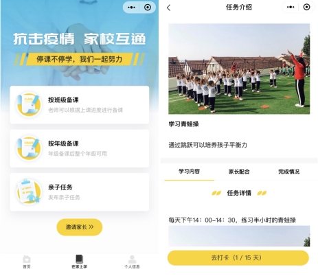 為此,“學子通”上線了“在家上學”功能,老師們可根據(jù)實際需要,選擇“按班級備課”或“按年級備課”,針對班級或年級將錄制好的備課內容,如防疫小知識、親子閱讀、親子游戲等內容上傳到“在家上學”模塊,讓孩子“宅”在家中也不停止學習的腳步。此外,老師還可通過設置親子小任務,如一起做青蛙操、讀讀繪本小故事和親子手工藝等,讓家長和學生一起參與,并可設置打卡,調動起學生的學習興趣,既增加親子感情,又讓學生開展室內鍛煉活動、開展課外閱讀,保持良好的身體狀態(tài),讓宅在家中的假期生活變得豐富。