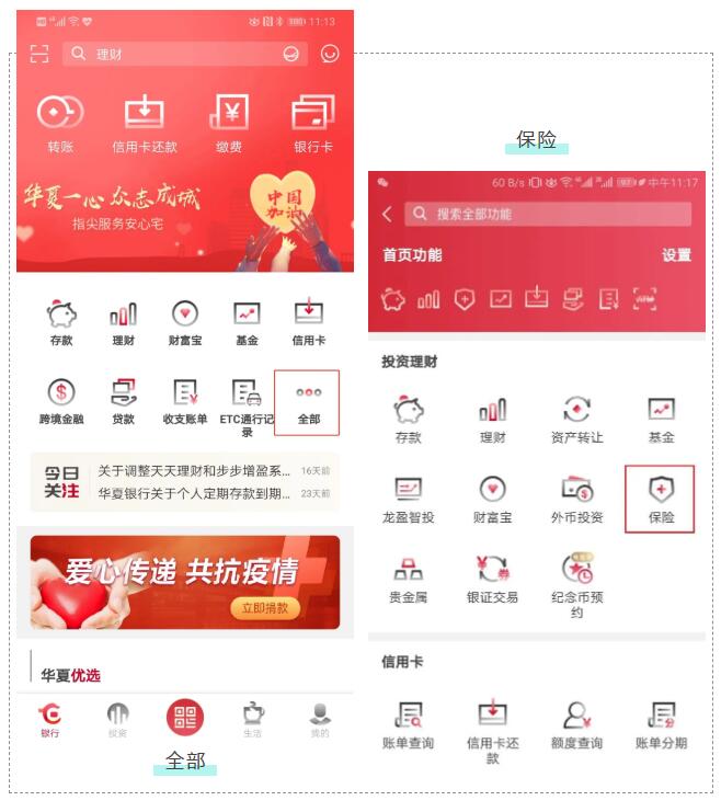 溫馨提示:如果您尚未對您及您的家庭做保險配置,在疫情時期可以通過華夏銀行手機銀行APP足不出戶配齊保險保障。您只需要打開華夏銀行手機銀行,在首頁通過“全部”菜單,進入“投資理財”板塊,點擊“保險”即可進入保險板塊,按照產品類型、場景選擇您需要的產品進行購買。