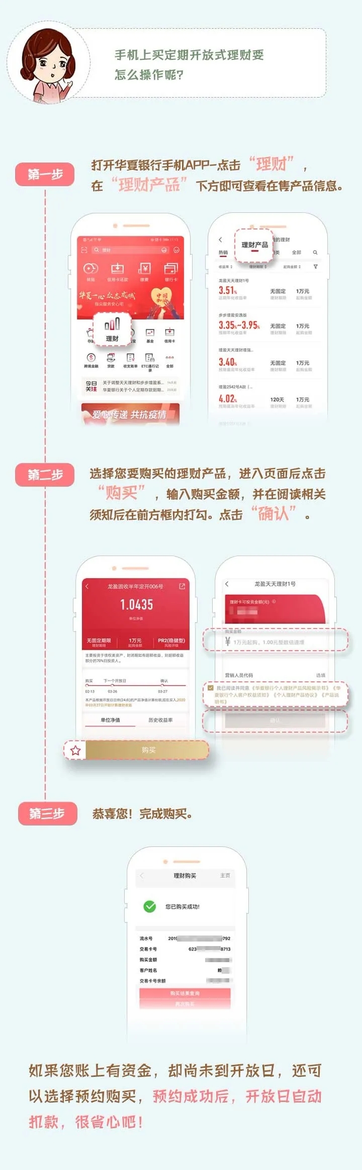 B:盡管足不出戶,您依然能享受著華夏銀行便捷安全的線上服務,開展投資理財業(yè)務,辦理理財產品、信托產品、代銷證券類產品的認申購、贖回等。