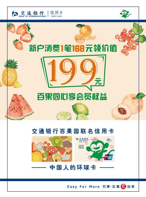 這款卡片不僅卡面超可愛,有五彩繽紛的水果圖案,也有百果園的猴果果logo,元氣滿滿;福利也很硬核,現(xiàn)在辦理交通銀行百果園聯(lián)名信用卡,新戶達標就可以免費領(lǐng)價值199元百果心享會員年卡,擁有它就擁有百果園的上千元權(quán)益!