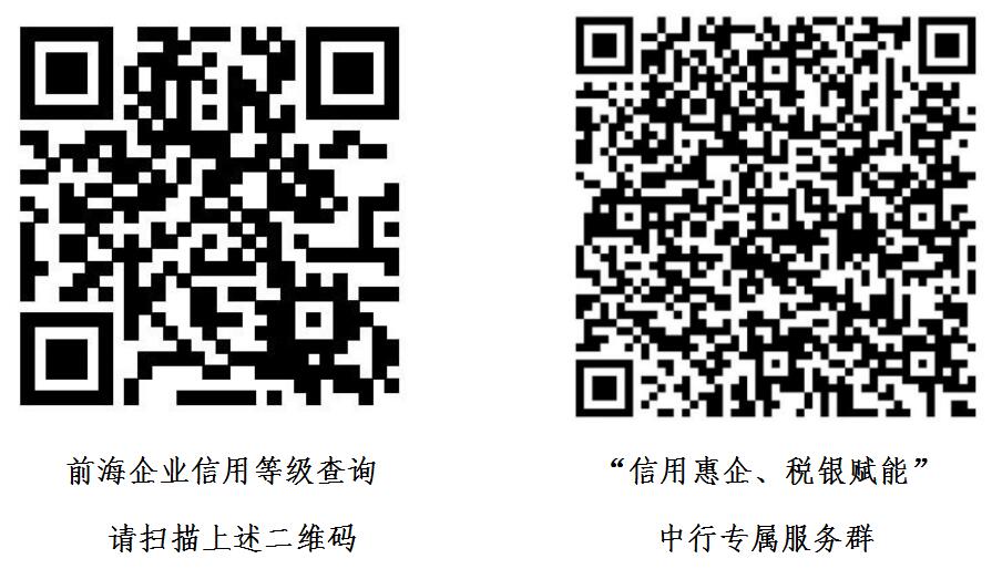前海注冊(cè)企業(yè)可通過(guò)下左二維碼查詢前海信用等級(jí),可通過(guò)下右二維碼加入“信用惠企、稅銀賦能”中行專屬服務(wù)群(入群請(qǐng)備注企業(yè)名稱),了解咨詢深圳中行針對(duì)前?!氨趟{(lán)企業(yè)”和“湛藍(lán)企業(yè)”的十項(xiàng)具體服務(wù)內(nèi)容。(黃璜)