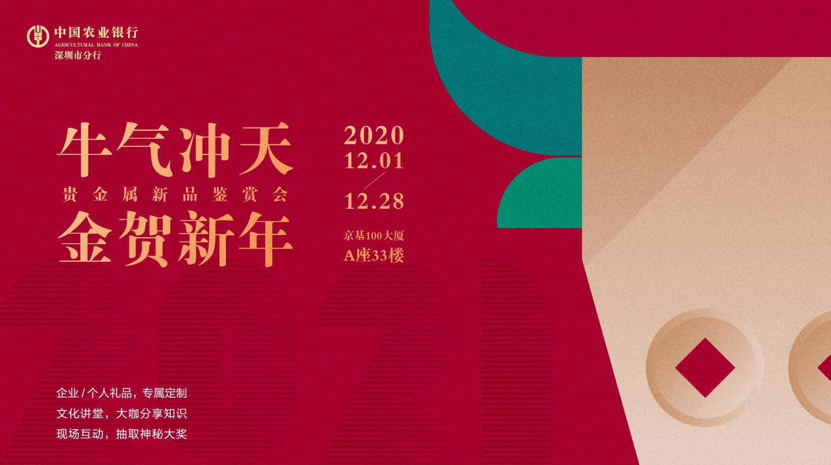 深圳新聞網(wǎng)·見圳客戶端2020年12月1日訊 為滿足客戶的多元化贈(zèng)禮、收藏、投資需求,為客戶提供個(gè)性化定制服務(wù),2020年12月1日至28日,深圳農(nóng)行在京基100大廈A座33樓舉辦“牛氣沖天·金賀新年”貴金屬新品鑒賞會(huì)。