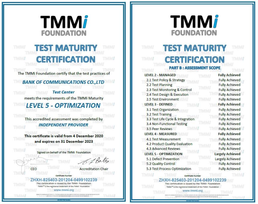 TMMi認證是當前國際上最權威的測試組織成熟度認證體系,也是軟件產品質量管理水平最有力的資質證明,最高級別為五級。此次獲得五級認證,標志著交行的軟件測試能力、產品質量管理水平、風險應對能力、測試過程改進能力、測試技術創(chuàng)新能力的整體成熟度均已達到國際領先水平。