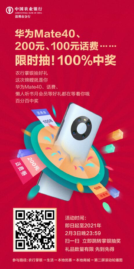 深圳新聞網(wǎng)·見圳客戶端2021年1月2日訊 農(nóng)歷新年越來越近,農(nóng)行掌銀讓您足不出戶,動動手指抽好禮,這次錦鯉就是你!華為Mate40、200元話費、100元話費等好禮,限時抽。
