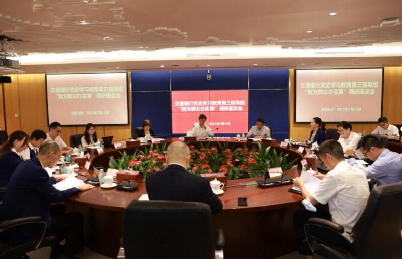 此外,交通銀行黨委黨史學習教育第三指導組(宣講團)與支行及部門負責人代表、黨員代表、群眾代表等干部員工圍繞分行“我為群眾辦實事”進展情況、分類指導工作開展情況、需要總行為基層辦實事的意見建議等內容進行面對面調研座談,并通過個別訪談、查閱資料等方式對深圳分行黨委推進黨史學習教育進展及學習效果等情況進行精細化指導、督導。
