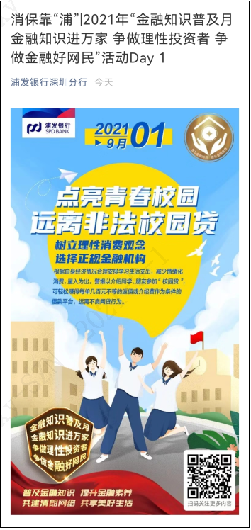 9月1日,也是校園開學(xué)的日子。開學(xué)的第一天,浦發(fā)銀行深圳分行特別推出“點(diǎn)亮青春校園遠(yuǎn)離非法校園貸”日歷宣傳海報(bào),并在官方微信公眾號(hào)進(jìn)行轉(zhuǎn)發(fā)宣傳,同時(shí)在46家網(wǎng)點(diǎn)營業(yè)大廳顯示屏播放,重點(diǎn)傳播校園貸金融知識(shí),提醒學(xué)生人群,合理消費(fèi),遠(yuǎn)離不良網(wǎng)貸行為。據(jù)悉,該行將在九月每個(gè)工作日持續(xù)發(fā)布消保宣傳日歷,常態(tài)化長效推進(jìn)金融知識(shí)普及月宣傳活動(dòng)的開展。