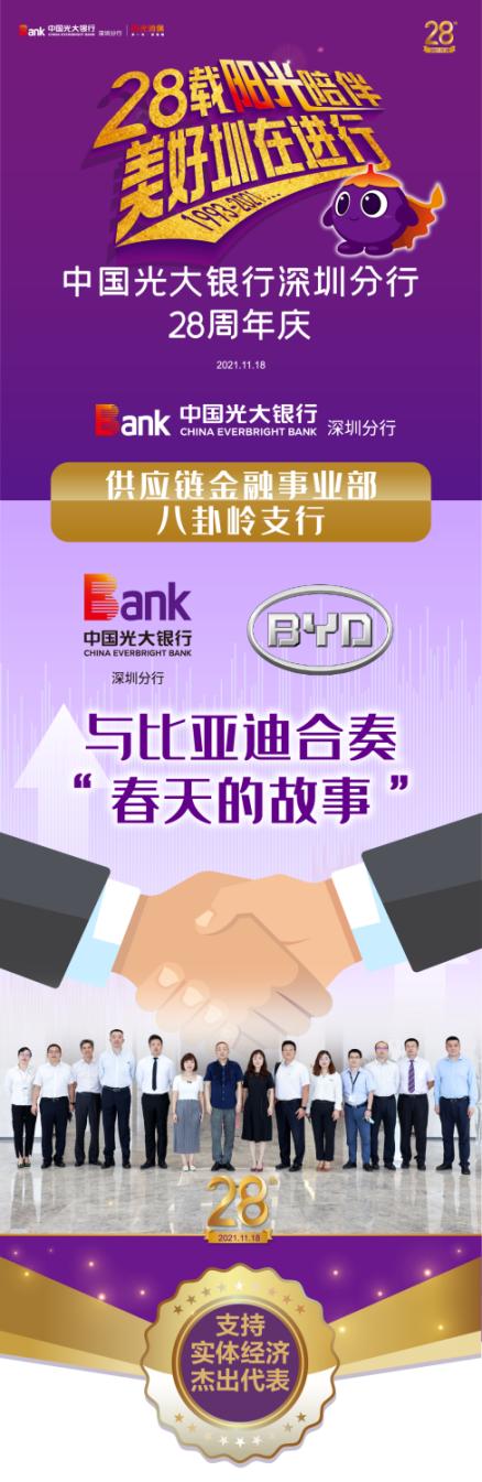 作為光大銀行深圳分行首批成立的支行之一,八卦嶺支行是服務(wù)比亞迪的“第一線”。一個個服務(wù)實體經(jīng)濟、相伴成長的動人故事,成為八卦嶺支行代代相傳的寶貴財富。在深圳分行28周年“十大最美光陰故事”評選中,供應(yīng)鏈金融事業(yè)部與八卦嶺支行榮獲支持實體經(jīng)濟杰出代表。