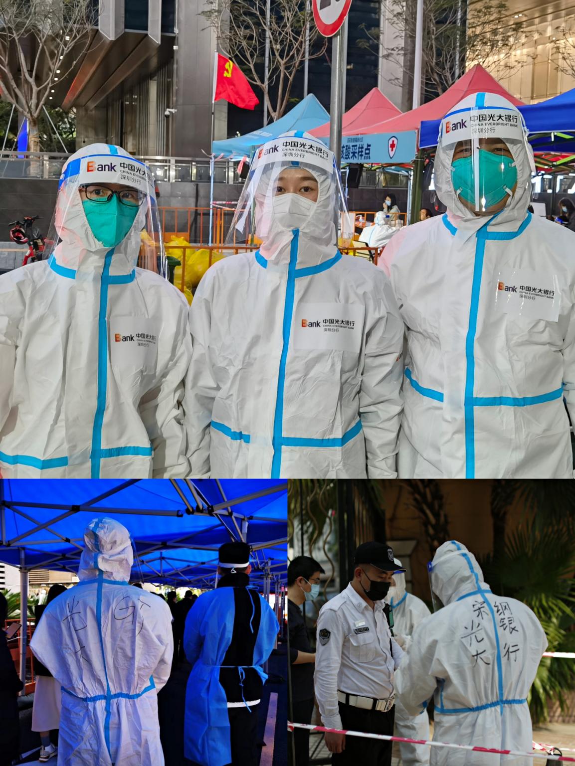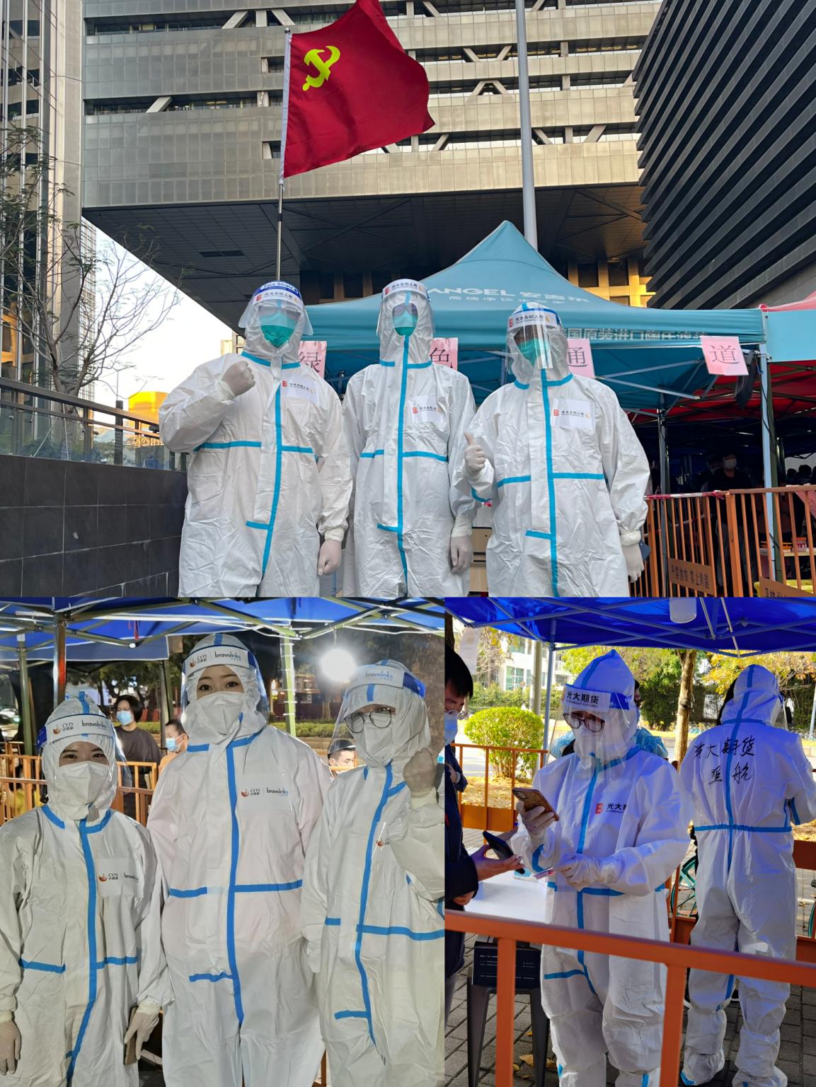 在疫情防控的關(guān)鍵時(shí)期,深圳分行黨委堅(jiān)決貫徹落實(shí)當(dāng)?shù)卣姆揽匾?,分行黨委書記、行長韓學(xué)智同志緊急召開黨委會(huì)議,啟動(dòng)應(yīng)急預(yù)案,積極部署并投入疫情防控工作,確保日常營運(yùn)和客戶服務(wù)等工作有序運(yùn)轉(zhuǎn)。在深圳福田區(qū)金融工作局的組織與號(hào)召下,分行黨委要求全體黨員干部發(fā)揮先鋒模范作用,主動(dòng)為社區(qū)疫情防控工作提供志愿服務(wù)。分行黨委委員們率先垂范,分頭帶領(lǐng)黨員干部奔赴社區(qū)慰問抗戰(zhàn)一線工作人員,并犧牲周末休息時(shí)間深入社區(qū)核酸采樣點(diǎn),脫下西裝變身“大白”。深圳分行各黨支部和團(tuán)支部先后組織開展各類志愿服務(wù)累計(jì)時(shí)長超過100小時(shí),活躍在防疫抗疫一線的同志們?cè)谌ΡU蠌V大群眾金融服務(wù)需求的同時(shí),和醫(yī)護(hù)工作者一同守護(hù)著千家萬戶。作為集團(tuán)駐深企業(yè)協(xié)同工作的牽頭單位,分行牽頭組建駐深企業(yè)志愿者先鋒隊(duì),緊急投身福田區(qū)抗擊疫情的各個(gè)戰(zhàn)線和各個(gè)角落,不分晝夜、不論疲倦、以實(shí)際行動(dòng)踐行初心、使命和擔(dān)當(dāng),弘揚(yáng)新時(shí)代共產(chǎn)黨人的奉獻(xiàn)精神?!叭绻皇怯H身體驗(yàn)志愿者服務(wù)工作,永遠(yuǎn)不知道抗疫人員的工作是如此辛苦!有多少人在負(fù)重前行才確保了深圳市民有序和安寧的生活。此刻很想擁抱可親可敬的你們,防護(hù)服雖然阻擋了我們的擁抱,但無法阻擋我們一起抗擊疫情的心?!币晃恢驹刚哌@樣記錄到。
