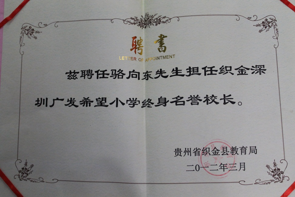 2013年,在駱向東的退休儀式上,織金縣教育局將一張希望小學(xué)終身名譽(yù)校長(zhǎng)的聘書(shū),鄭重交到了他的手上。“我很榮幸能代表廣發(fā)銀行深圳分行黨委去推動(dòng)這件事,但公益事業(yè)任重道遠(yuǎn),我相信愛(ài)心基因會(huì)在廣發(fā)一直傳承下去?!笔聦?shí)也正如駱向東所言,從1998年籌建希望小學(xué)至今,一代代廣發(fā)人身體力行,讓愛(ài)心助學(xué)一棒接力一棒。
