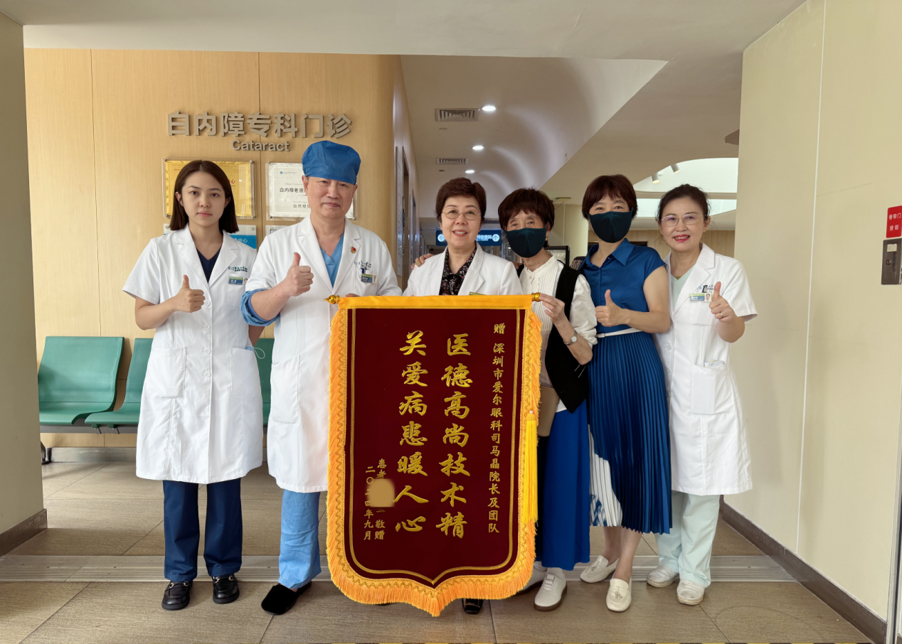 完成手術(shù)的劉奶奶心情無比輕松,坐在輪椅上被推出手術(shù)室時(shí),她向醫(yī)護(hù)人員豎起了大拇指。兩天后,劉奶奶又順利進(jìn)行了另一只眼的手術(shù)。通過飛秒激光輔助白內(nèi)障手術(shù),一次性解決了她的白內(nèi)障、遠(yuǎn)視、散光及老視等多種眼病困擾。術(shù)后,她為醫(yī)護(hù)人員送來錦旗,激動地抱著司馬晶教授道謝:“感謝您治好了我的眼睛,我現(xiàn)在看遠(yuǎn)看近都很清楚,真后悔沒有早點(diǎn)做這個(gè)手術(shù)!”