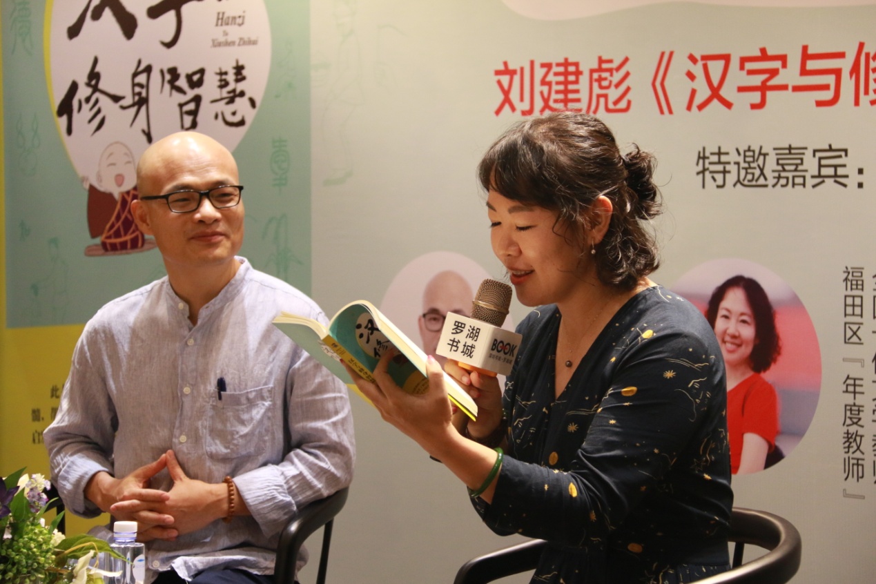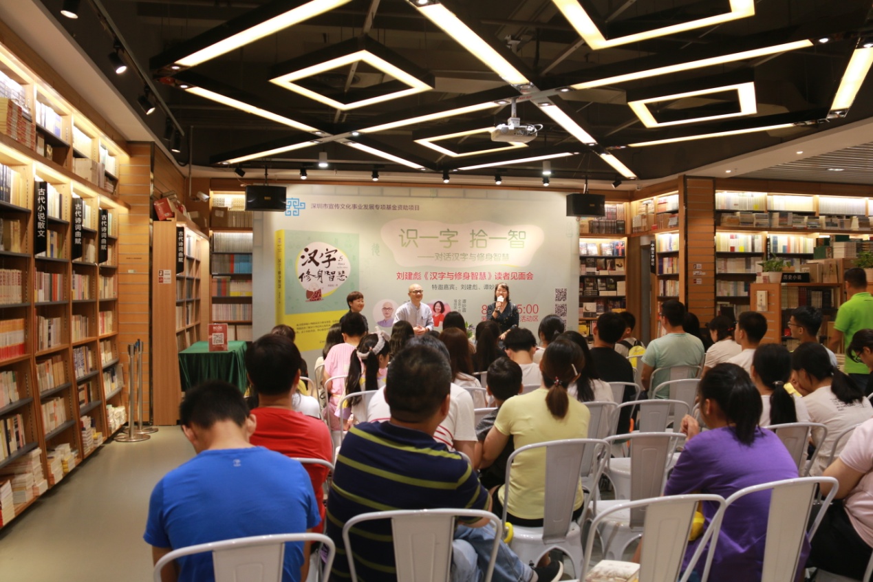 活動(dòng)由深圳書城羅湖城張華女士主持,邀請(qǐng)到壹讀書會(huì)創(chuàng)始人、知名閱讀推廣人、 《漢字與修身智慧》作者劉建彪先生和全國(guó)十佳文學(xué)教師、廣東省閱讀推廣“點(diǎn)燈人”譚妙蓉女士擔(dān)任對(duì)話嘉賓,為聽(tīng)眾講述漢字的起源以及他們根據(jù)切身體會(huì)對(duì)漢字的解讀。