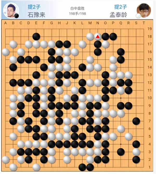 慢棋第三臺(tái)由小將石豫來(lái)三段執(zhí)黑對(duì)陣孟泰齡七段。開(kāi)局黑左上連續(xù)失誤,導(dǎo)致局面早早進(jìn)入不利的戰(zhàn)斗。之后黑棋四處求戰(zhàn)終顯勉強(qiáng),最終以死去中央大龍的代價(jià)吃掉白棋右邊一塊大棋,依然以較大差距落敗,石豫來(lái)執(zhí)黑中盤(pán)負(fù)孟泰齡。