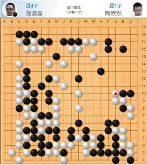 慢棋第四臺(tái)由深圳隊(duì)的陶欣然八段執(zhí)白對(duì)陣天津隊(duì)的堯?yàn)t童二段。雙方開(kāi)局形成少見(jiàn)的新變化,白棋取得優(yōu)勢(shì)。之后白棋牢牢掌控局面,至132手兵不血刃快勝,陶欣然執(zhí)白中盤(pán)勝堯?yàn)t童。