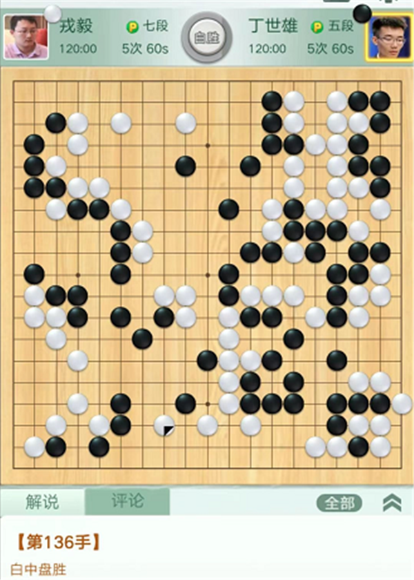 第三臺慢棋,由深圳隊戎毅七段執(zhí)白對陣衢州隊丁世雄五段。開局右下角變化黑棋虧損。之后白棋右上角試應手時,黑棋選擇脫先吃白中間殘子失誤。白棋棄掉幾子在右上黑空先手活出,大幅領先。之后白棋安全運轉直至終局,戎毅執(zhí)白中盤勝丁世雄。