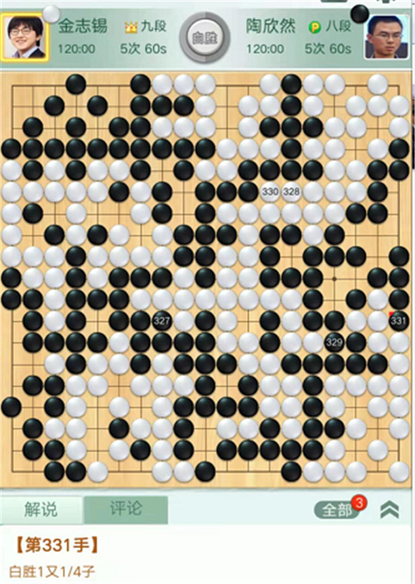 第二臺主將臺,由深圳隊陶欣然八段執(zhí)黑對陣衢州隊韓國外援、世界冠軍金志錫九段。開局下方戰(zhàn)斗雙方各有失誤,局面依然均勢。之后左上角形成打劫,白棋棄劫右上打穿黑空各有所得。黑棋攻擊左上角白棋時候白棋應對失誤,黑棋取得領先。白棋看到形勢不利放出勝負手,打入上邊黑空過分,黑棋反擊后白棋極其危險。關鍵時候黑棋鼠標點錯,給自己留下一個斷點,被白棋活出后,局面難以挽回,陶欣然執(zhí)黑1又1/4子負金志錫。