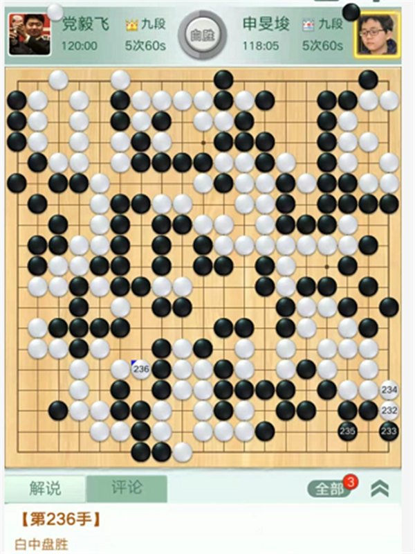 第一臺(tái)慢棋,由深圳隊(duì)的外援申旻埈九段執(zhí)黑對(duì)陣成都隊(duì)的世界冠軍黨毅飛九段。右下角白棋出現(xiàn)失誤,黑棋沒(méi)有抓住機(jī)會(huì)反而被白棋便宜不少。之后黑棋頑強(qiáng)追趕局面一度接近。但是官子階段黑棋始終沒(méi)有發(fā)現(xiàn)左上角官子便宜的小巧手,被白消除隱患后,白勝勢(shì)。申旻埈執(zhí)黑中盤(pán)負(fù)黨毅飛。