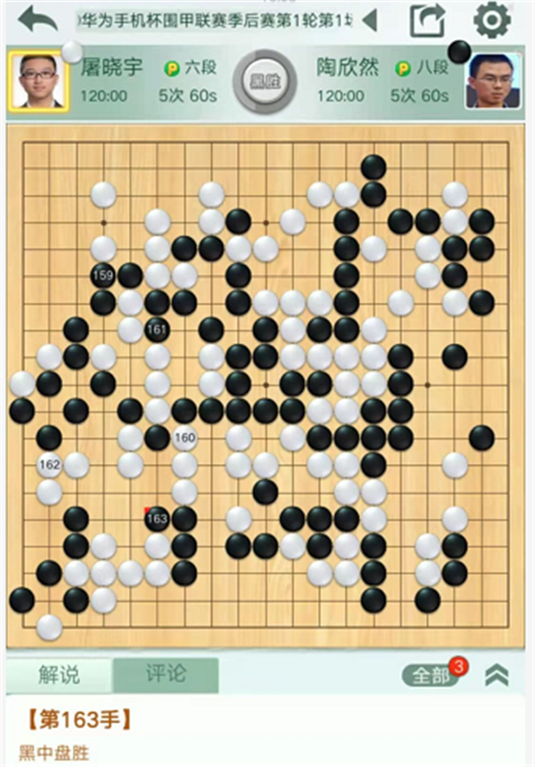 第四臺(tái)慢棋,由深圳隊(duì)陶欣然八段執(zhí)黑對(duì)陣民生隊(duì)的屠曉宇六段。開(kāi)局雙方互圍大模樣。白棋右邊在黑空試應(yīng)手時(shí)黑方強(qiáng)烈反擊。白棋沒(méi)有下出做活的手段,不得不付出很大代價(jià)出頭跑出,黑優(yōu)勢(shì)。之后中央白棋混戰(zhàn)中戰(zhàn)略方向錯(cuò)誤,黑棋優(yōu)勢(shì)擴(kuò)大。最后黑棋在左邊白棋空里薄弱處出棋,一舉獲勝。陶欣然執(zhí)黑中盤(pán)勝屠曉宇。