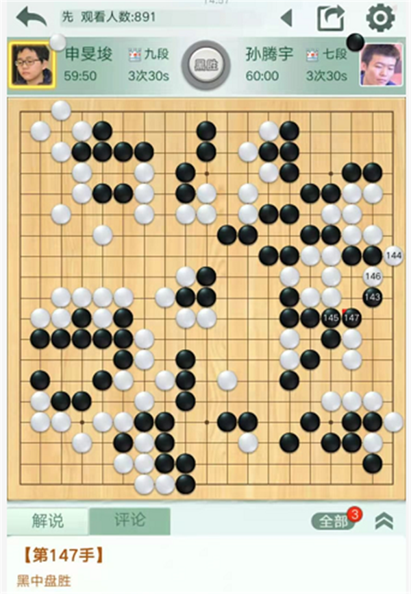 第一臺(tái)快棋,由深圳隊(duì)外援申旻埈九段執(zhí)白對(duì)陣民生隊(duì)的孫騰宇七段。白棋開(kāi)局順暢,中盤(pán)下邊雙方小有失誤,依然白棋領(lǐng)先。之后白棋良好的掌握局面,優(yōu)勢(shì)擴(kuò)大。進(jìn)入官子,白棋沒(méi)有補(bǔ)掉隱患,進(jìn)入中央破黑空時(shí)較為沖動(dòng),選點(diǎn)失誤造成虧損。最后被黑右邊進(jìn)入白空后反殺白棋,申旻埈執(zhí)白中盤(pán)負(fù)孫騰宇。